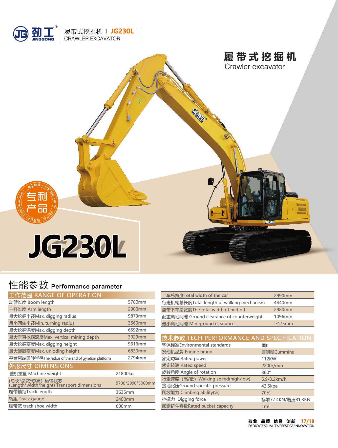 JG230L Crawler Excavator, Heavy-Duty Customizable Construction Machinery with Cummins Engine & 1m³ Bucket Capacity