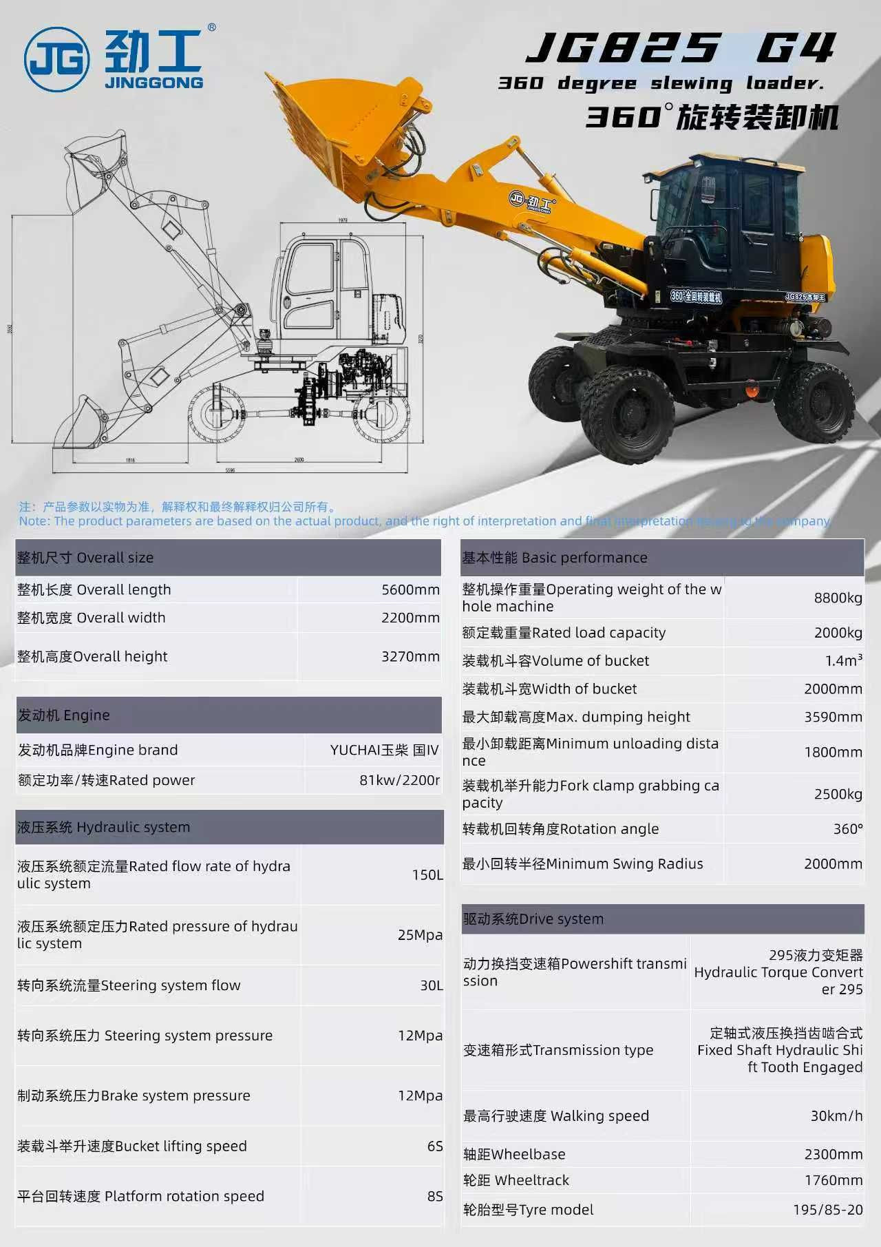 JG825 360° Rotating Loader, Wheeled Construction Machinery with 1.4m³ Bucket for Efficient Loading & Unloading